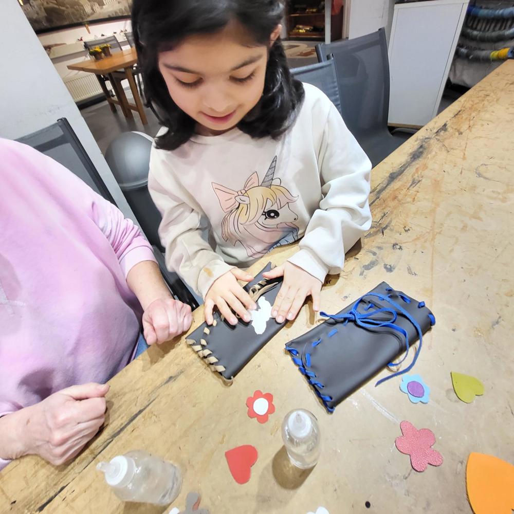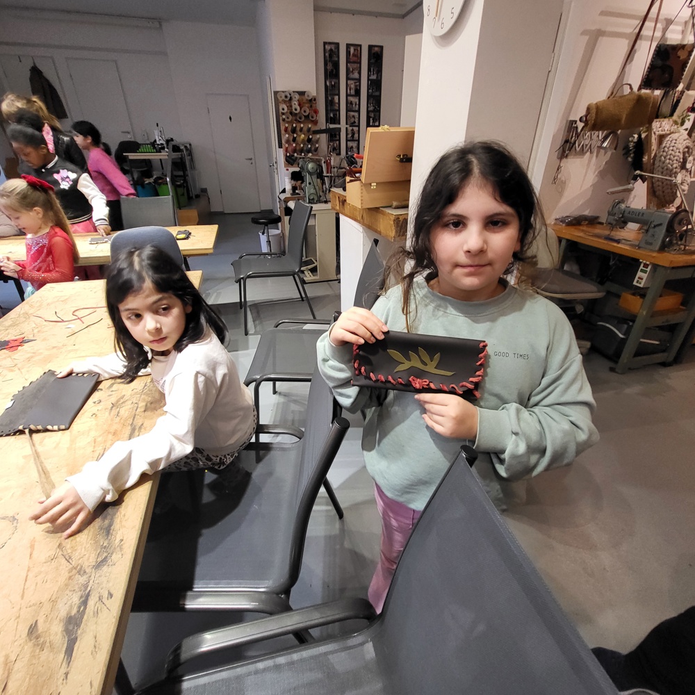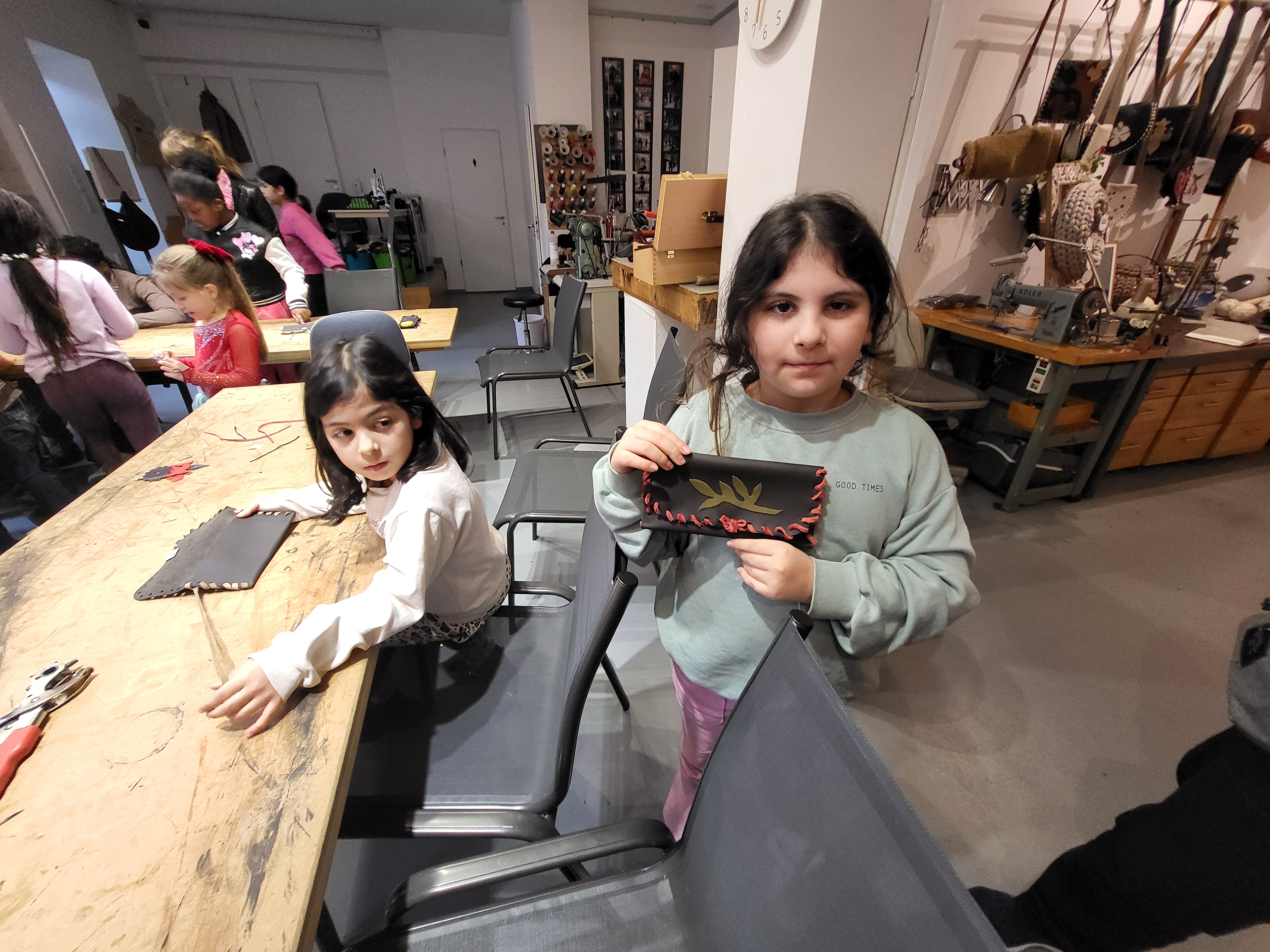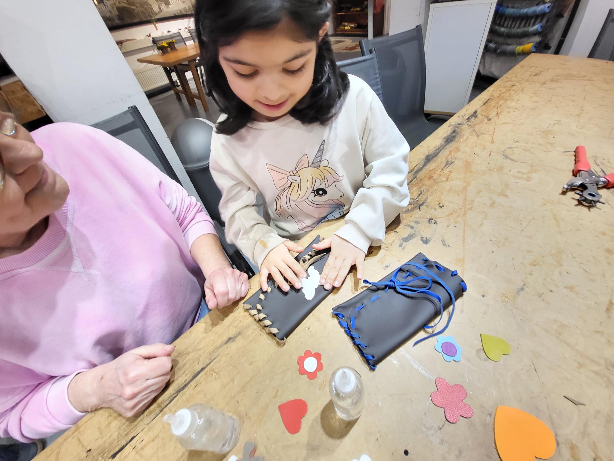 Im Anschluss durften die Kinder selbst kreativ werden: Mit viel Freude bastelten sie ihre eigenen kleinen Ledertaschen. Mit großer Konzentration und Begeisterung entstanden ganz individuelle Stücke – und am Ende trug jedes Kind stolz seine eigene Tasche nach Hause.